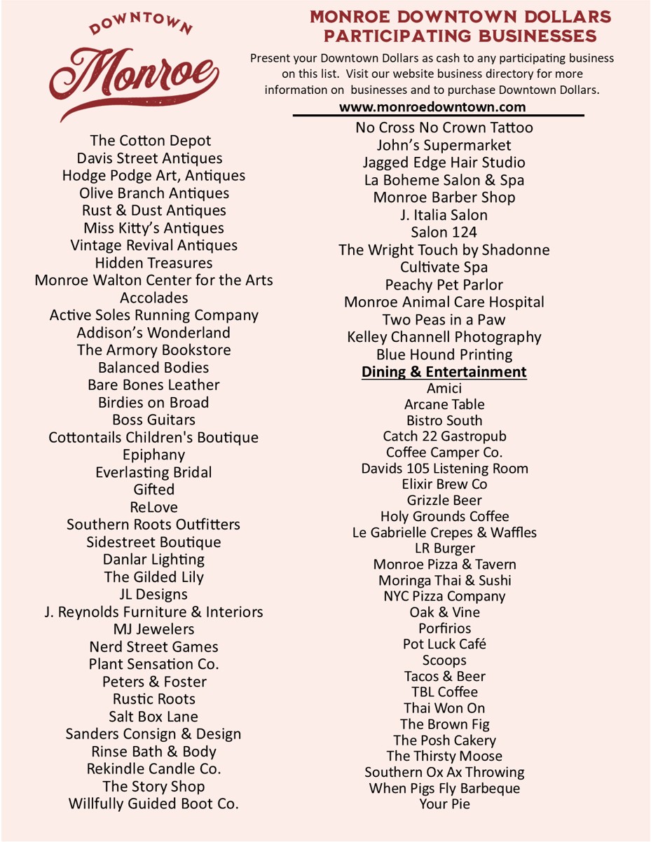 Downtown Dollars come in $10 certificates that can be used in any participating Downtown Monroe shops and restaurants just like cash. Purchases can be made online or in person, orders can then be picked up at the Welcome Center at 227 South Broad Street or you can have them mailed directly to you.